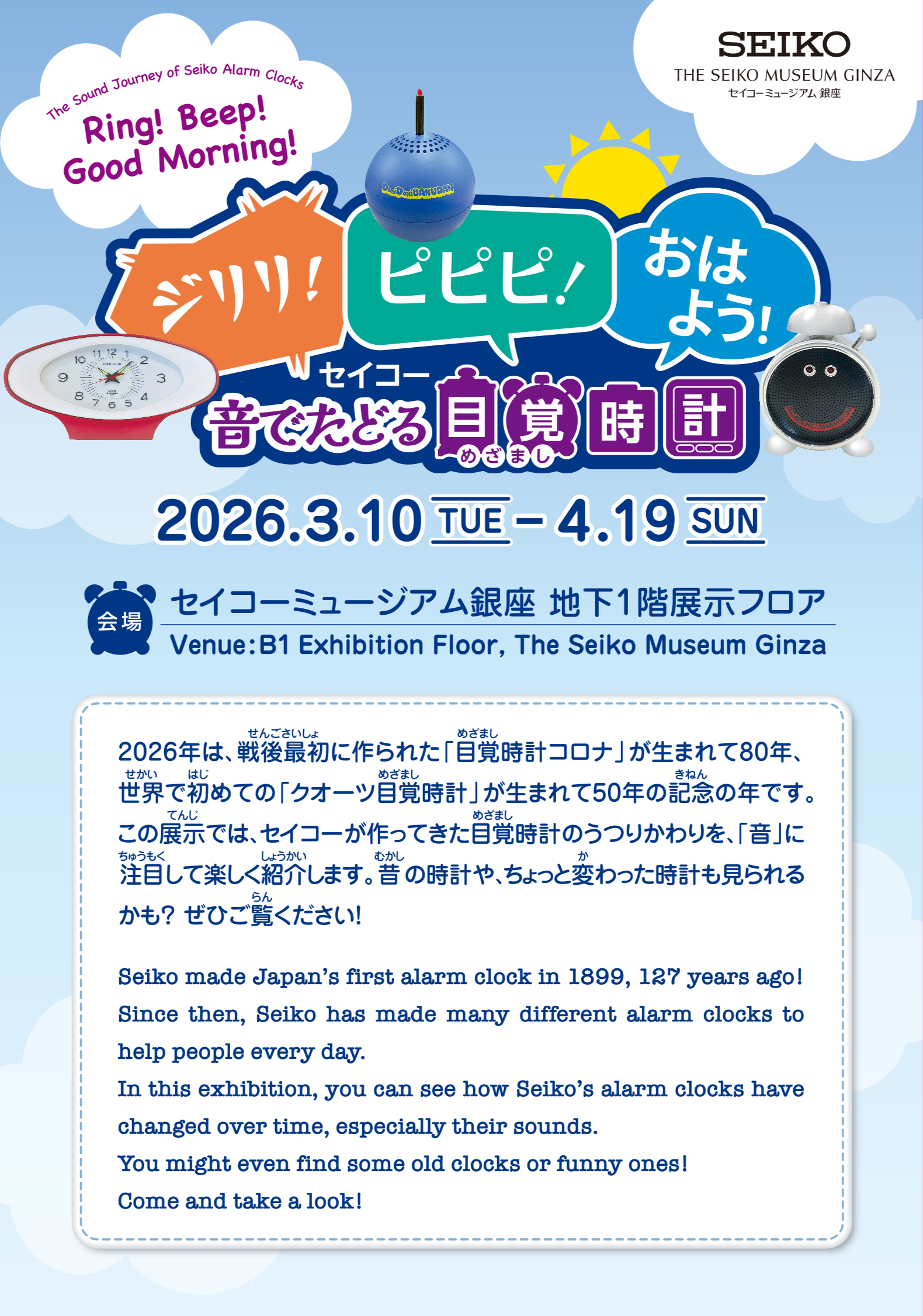 We are pleased to announce a special exhibition themed “Ring! Beep! Good Morning! The Sound Journey of Seiko Alarm Clocks”, opening on March 10.