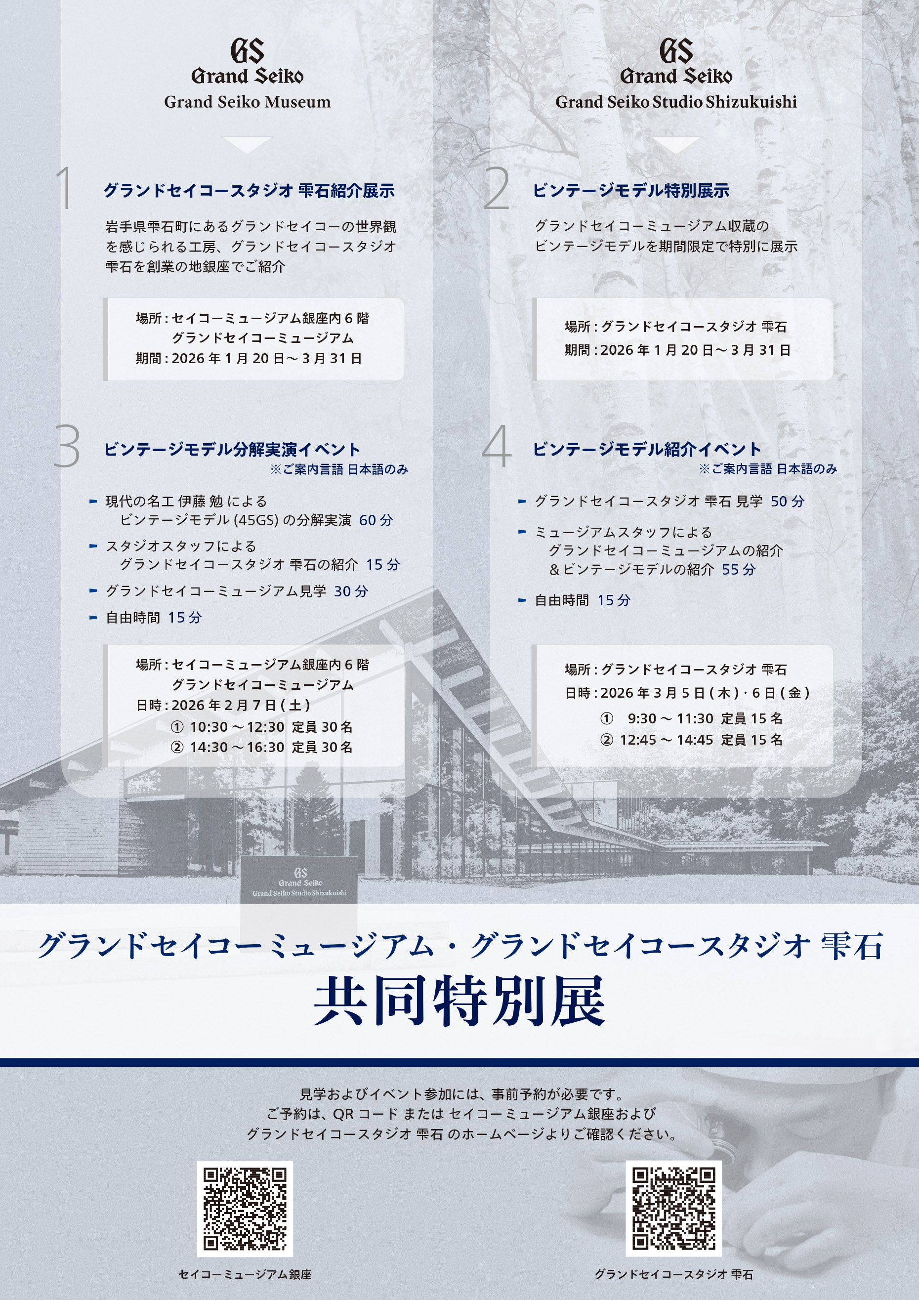 ご予約は、下記チラシに掲載されているQRコードまたはセイコーミュージアム銀座およびグランドセイコースタジオ 雫石のホームページよりご確認ください。